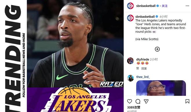 根据HoopsHype名记Michael Scotto报道,试图引进一名3D侧翼的湖人队对于赫伯特琼斯非常喜爱,联盟内部也普遍认为琼斯价值在2枚首轮上下。